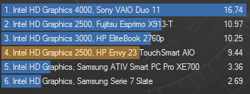 Le scarse prestazioni della scheda video sono confermate anche dai test effettuati con CineBench R11.5 che pone l’HP Envy 23 TouchSmart sotto anche ai vecchi Tablet PC con processore Sandy Bridge come l’HP EliteBook 2760p; la distanza con i Tablet PC dotati di processore Intel Core di terza generazione è enorme. Relativamente bassa invece la differenza con il Fujitsu Esprimo X913T che riesce ad ottenere un punteggio leggermente superiore solo grazie alla presenza di un processore Intel Core i5.