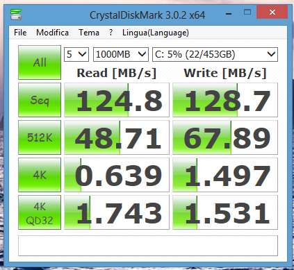 Dal punto di vista prestazionale, quindi, il processore Intel Core i3 per sistemi Desktop si dimostra decisamente buono, presentandosi anche come sensibilmente più veloce dei Core i7 a basso voltaggio montati sugli Ultrabook convertibili Sony VAIO Duo 11. Relativamente al disco, HP ha scelto di usare un normale disco rotante da 500 GB, con velocità di 7200 gpm e interfaccia SATA III. Come misurabile da CrystalDiskMark si tratta di un disco di buona qualità e con buone velocità in scrittura e lettura.