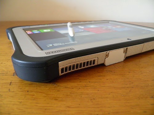Quello più piccolo, posizionato sul bordo in alto a lato della videocamera con flash LED, è la parte posteriore dell’alloggiamento per le porte opzionali: in fase di ordine è infatti possibile personalizzare il ToughPad FZ-G1 ed aggiungere a scelta una porta USB, seriale, LAN o un lettore di microSD. Tra i due rilievi è presente la vasta ventola di areazione, mentre sul bordo, a lato della batteria, è presente una piccola trincea che accoglie la penna durante il trasporto.