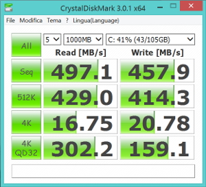 Particolarmente prestante il disco SSD, come bene evidenziato da CrystalDiskMark.
