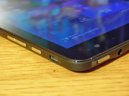 Particolarità del Dell Venue 8 Pro è l’assenza del pulsante Windows/Start in posizione frontale sotto lo schermo; il pulsante è invece posizionato sul lato alto del Tablet PC, a fianco del connettore audio – una posizione insolita, che forse sarebbe stata più adatta al pulsante di accensione, posizionato sul bordo destro tra la porta microUSB e il doppio pulsante del volume.