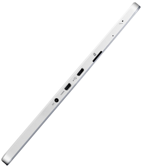 Se si guarda al Tablet PC puro, l’Acer Aspire Switch 10 si presenta come dotato di una connettività relativamente limitata. Sul lato destro del Tablet PC sono presenti una porta microUSB 2.0 (che non si usa per la carica del dispositivo) ed una uscita video microHDMI; a queste si affianca un lettore di schede microSD e il microfono. Il fatto che tutte le porte siano in formato “micro” fa alzare con insoddisfazione un sopracciglio, in quanto il Tablet PC avrebbe lo spessore per accogliere porte a piene dimensioni che non richiedono adattatori.