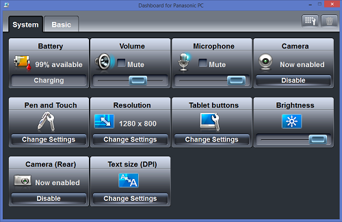 Tra le applicazioni Desktop sicuramente è da citare per qualità e funzioni la Dashboard per Panasonic PC, che permette di gestire in modo rapido la maggior parte delle impostazioni, al punto che ad esso è dedicato l’unico pulsante.