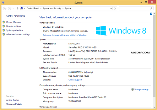 Il sistema operativo è nella versione “Windows 8.1 con Bing“, che le case produttrici possono installare gratuitamente a patto di non modificare il motore di ricerca predefinito (Bing, appunto). Dal punto di vista dell’utente non cambia però nulla, con Windows 8.1 con Bing che si presenta di fatto come un normalissimo Windows 8.1 e sul Mediacom W810 è possibile installare qualsiasi applicazione e usare qualsiasi motore di ricerca.
