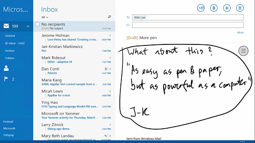 Microsoft ha già evidenziato alcune applicazioni che godranno delle nuove funzionalità: l’app Windows Mail, ad esempio, sarà in grado di ospitare inchiostro e gli utenti potranno inviare email scritte a mano o scriverle a mano e convertirle automaticamente in “testo battuto a macchina” prima dell’invio. Alla semplicità di creazione di applicazioni ottimizzate per l’uso con la penna – semplicità ereditata da Windows 8 ma purtroppo poco sfruttata – si affiancano importanti miglioramenti nella qualità finale dell’inchiostro e nell’esperienza utente generale.